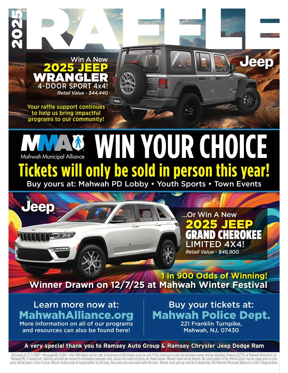 Get ready, Mahwah! The Mahwah Municipal Alliance (MMA) is kicking off its most anticipated event of the year—the Annual Jeep Fundraiser Raffle! This is your chance to win the ride of a lifetime while making a significant impact right here in our community. Imagine yourself hitting the road in a brand-new 2025 Jeep, knowing you helped support vital local programs.