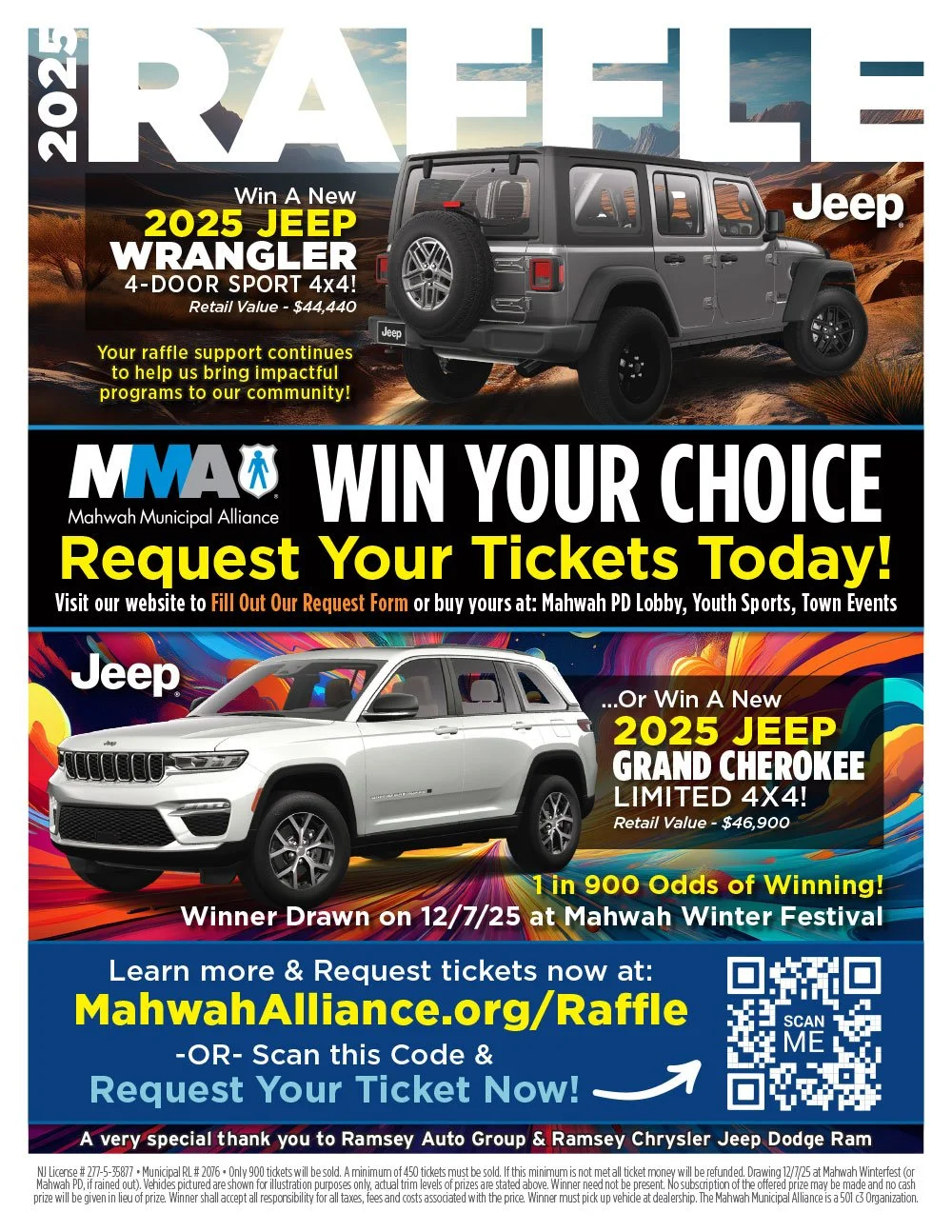 Your dream ride is waiting! The MMA's Annual Jeep Raffle is back. For just $100, you could win YOUR CHOICE of a 2025 Jeep Wrangler or Grand Cherokee. Tickets are sold in-person only at NJ’s Mahwah Police Station. Stop by the Mahwah Police Station to enter! Get yours today and support our community! Click to learn more...